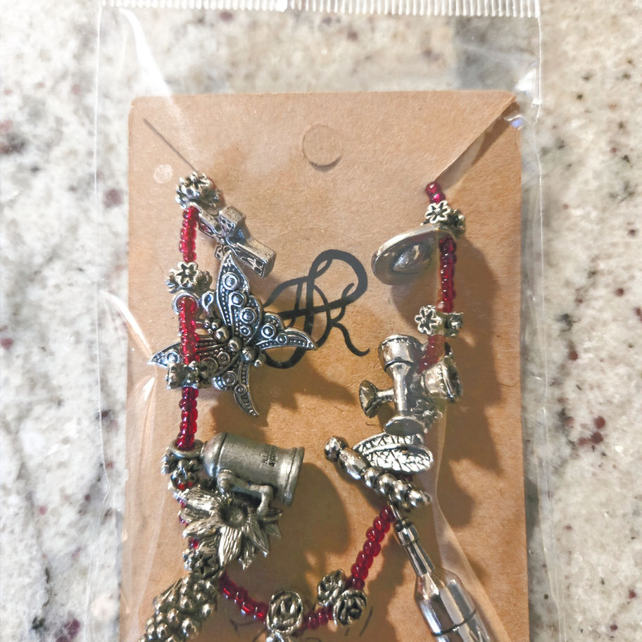 Metal charms: cross, butterfly, grinder, sunflower, grapes, roses, wine bottle, dragonfly, wine glasses, made with love, frog. Only the daisy spacers are 925 Sterling. 7 1/2 inches